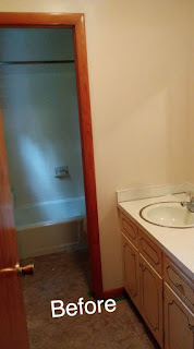 I hate 70s style wood trim. Seriously. I hate it. I don't think there's really anything from the 70s I care for actually but warm-toned wood trim is pretty high up there on the list. So between that and the dull/dirty cream walls and the out of place dated wannabe-French cottage style vanity I just needed to get in there and do something. After I started I realized how out of my depth I was and man alive I learned a LOT in the process. I mean, I don't think I could do it much better now but I could sure as heck tell YOU what not to do! Anyways here is the proof that it done got did
